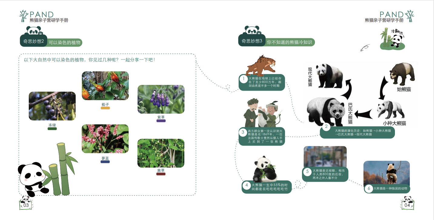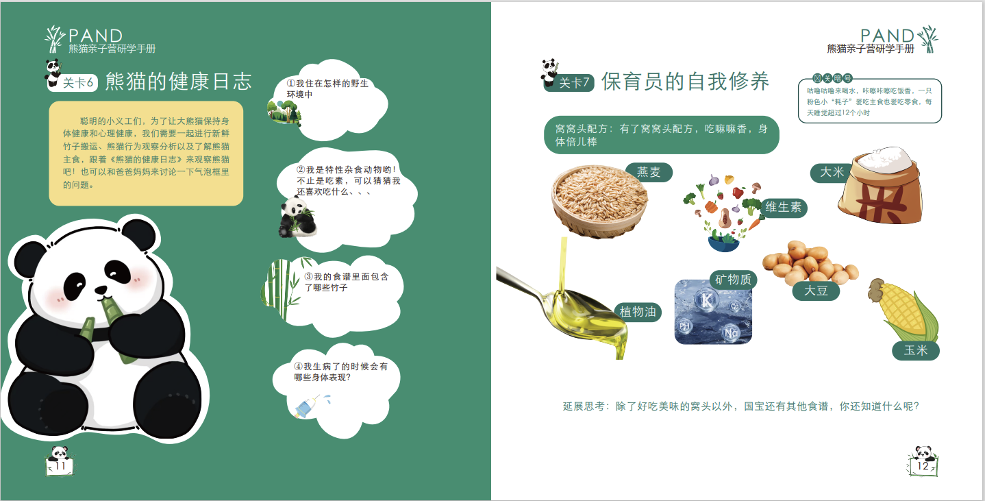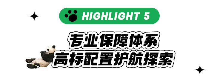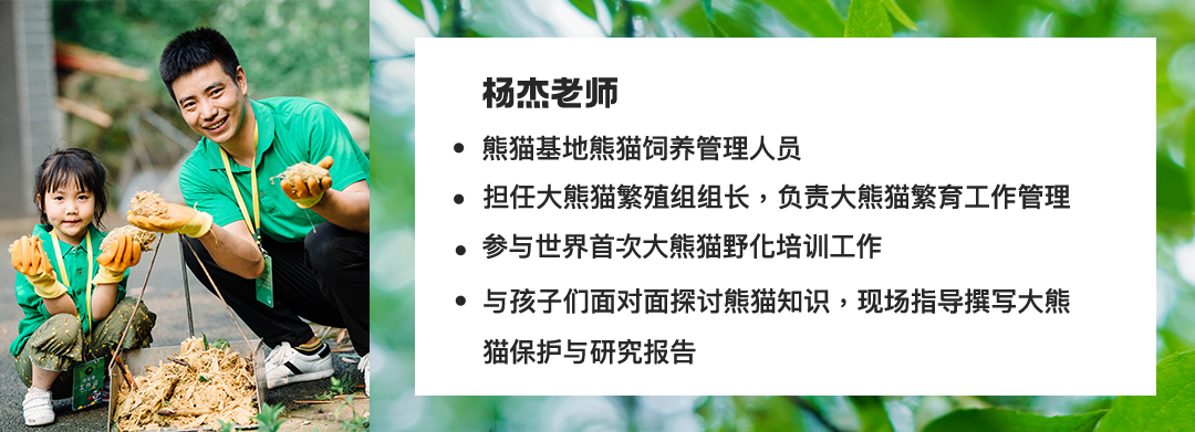 【国宝守护——化身小小“保育员”】从大熊猫的行为习性观察到深入大熊猫国家保护区,并做一名合格的国宝“铲屎官”,走进基地非游客区域进行义工体验。帮大熊猫搬运竹子、在饲养员带领下观看饲养员喂食熊猫、行为观察分析、“制作窝窝头”等等,争取当个被大熊猫认可的一日“保育员”