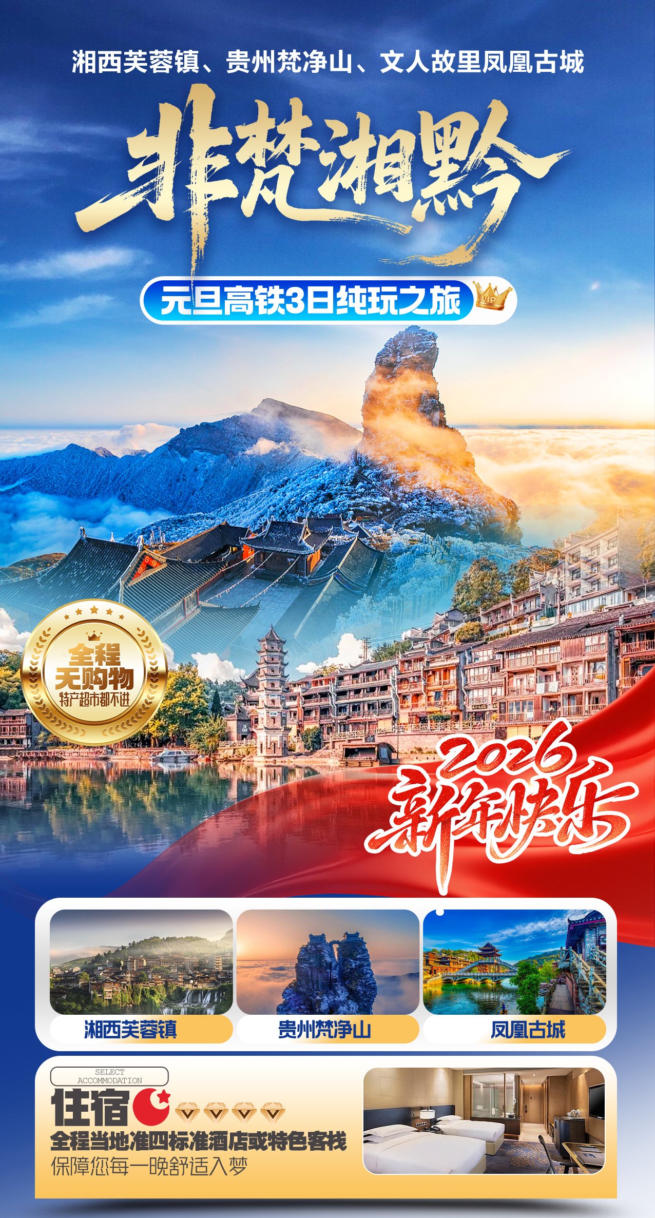 品质如一、放心出行!户外纯玩、广东成团! ★购物:全程无购物,特产超市都不进,没有任何隐性消费。 ★住宿:全程当地准四标准酒店或特色客栈,保障您每一晚舒适入梦 ★景点:最美小城--凤凰古城、挂在瀑布上的小镇--芙蓉古镇、梵天净土--梵净山
