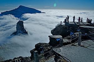 伴随穿破云雾的第一道阳光,梵净山云雾翻腾,视野逐渐通透,金色阳光洒满山间,“光雪雾”的交汇,梵净山美若仙境