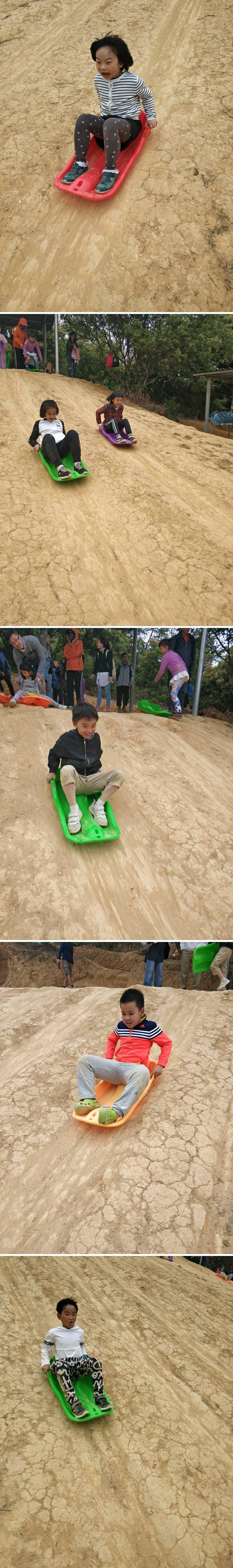 土坡滑草,坐在滑板上,一屁股溜下来,好玩、刺激,孩子们玩得都不愿意走。