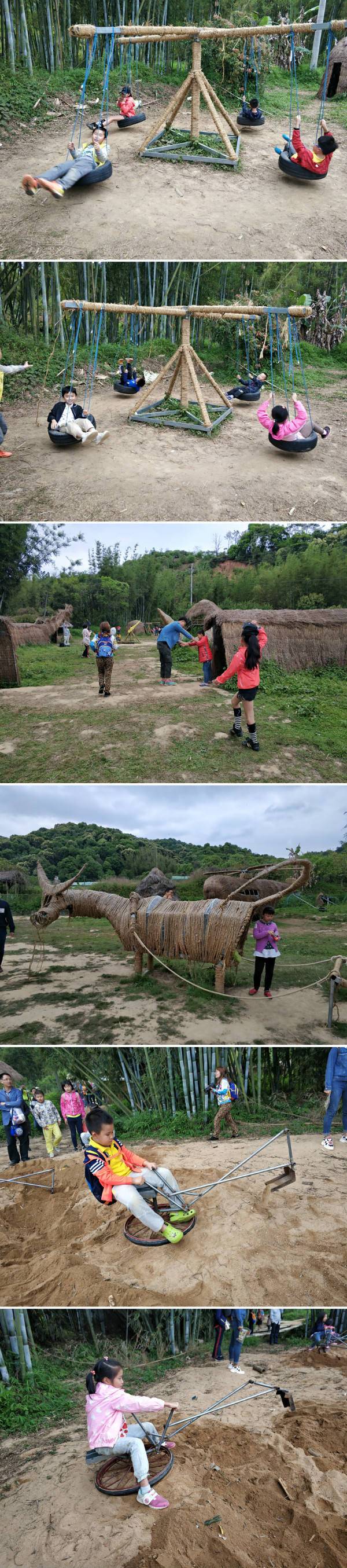 在野人部落自由地玩耍,可以开挖土机、可以玩旋转轮胎、可以抓迷藏、还可以玩稻草模型。