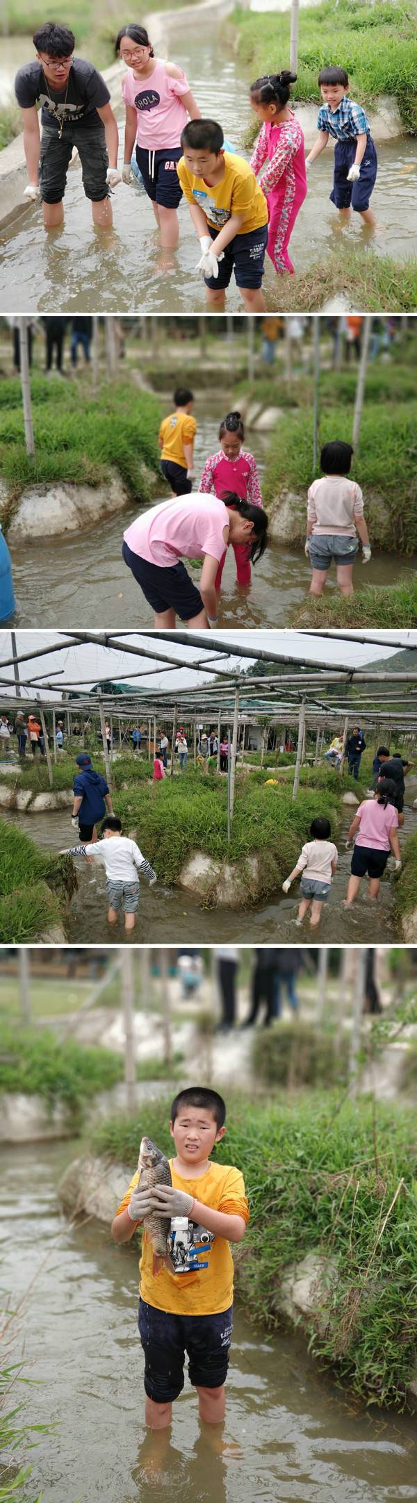 同学们之间相互合作,徒手抓鱼,终于抓到一条打鱼咯
