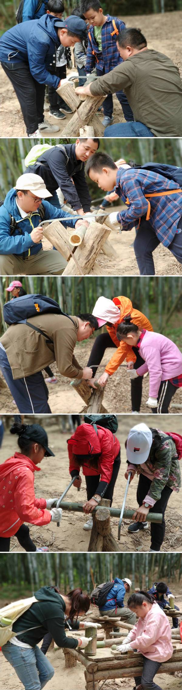 通过伙伴之间的合作,把一条长长的竹子分成一段段,做成自己喜欢的工艺品,笔筒、花筒、竹灯...