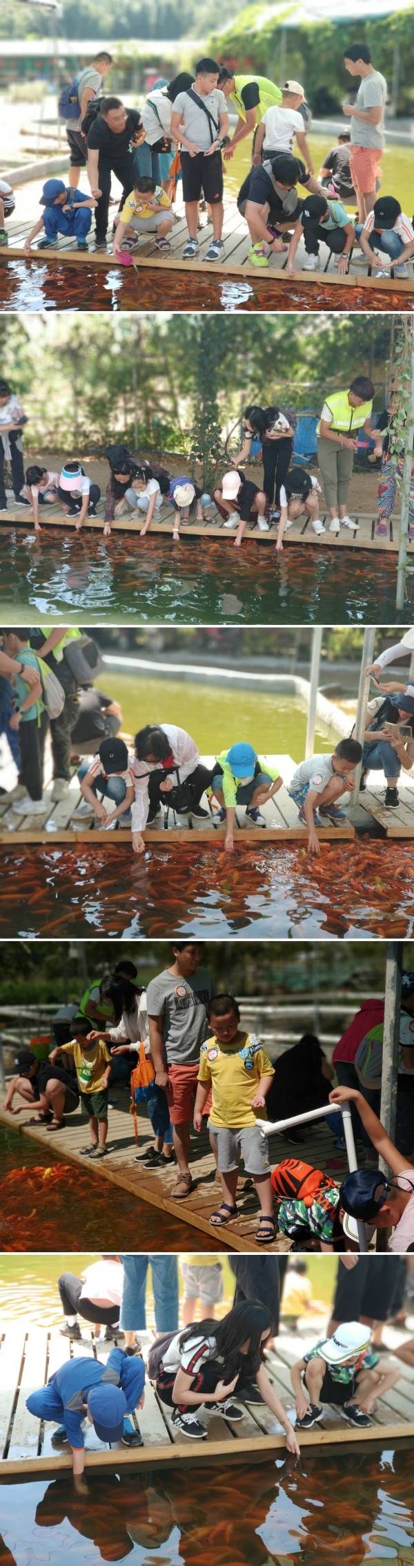 喂锦鲤鱼,手上抓住一把鱼食,放到池塘里,小鱼们快速跑过来吃,还可以给手做鱼疗,孩子们玩的乐此不疲。