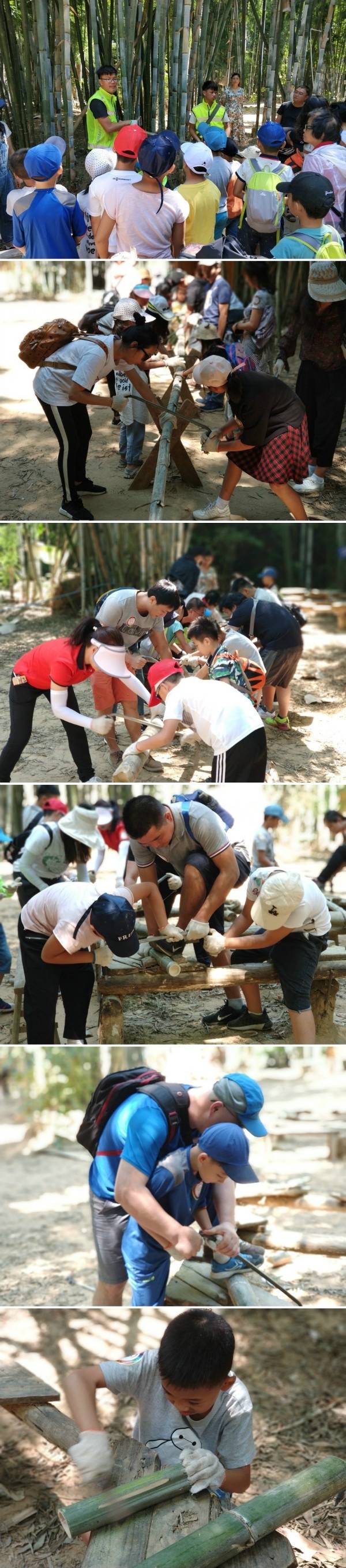 通过孩子和家长之间的合作,把一条长长的竹子分成一段段,做成自己喜欢的工艺品,笔筒、花筒、竹灯...