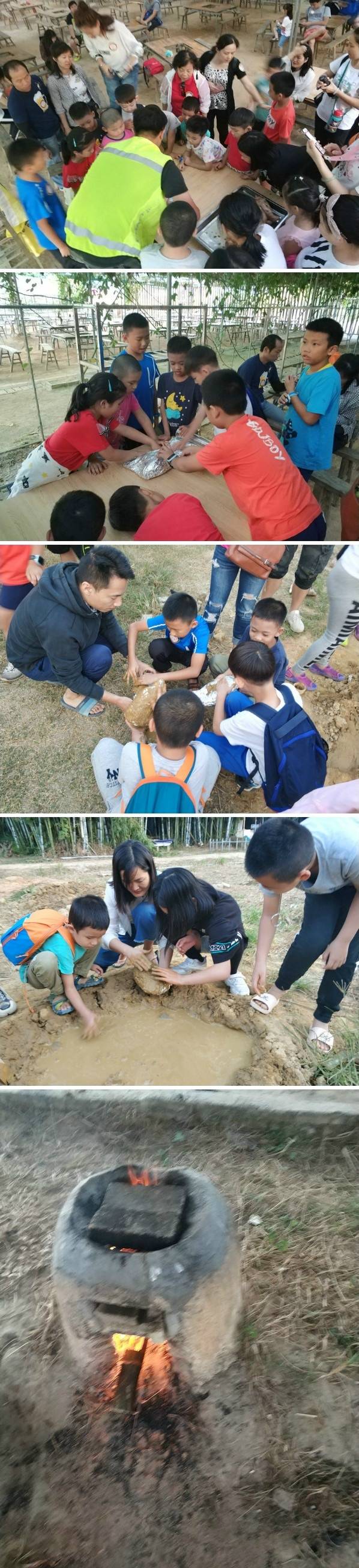 亲子导师教孩子们把鸡包裹好,糊上泥巴,放在土窑里,一起去竹林里捡些柴火,往窑里加碳...最后,香喷喷地上了饭桌!