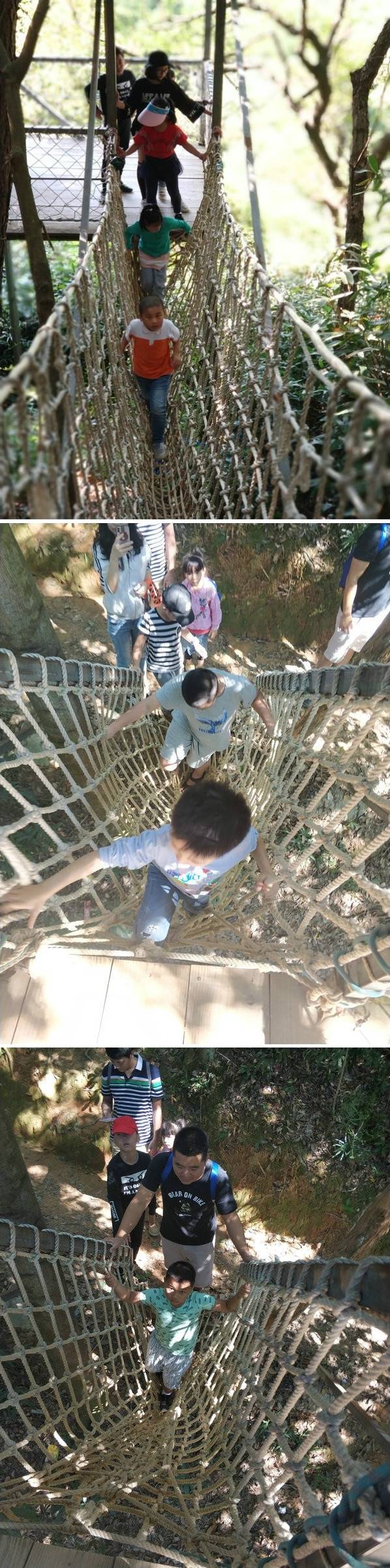 树上绳网,看似很简单,还需一定的平衡力和胆量,同学们直呼要多玩几次。