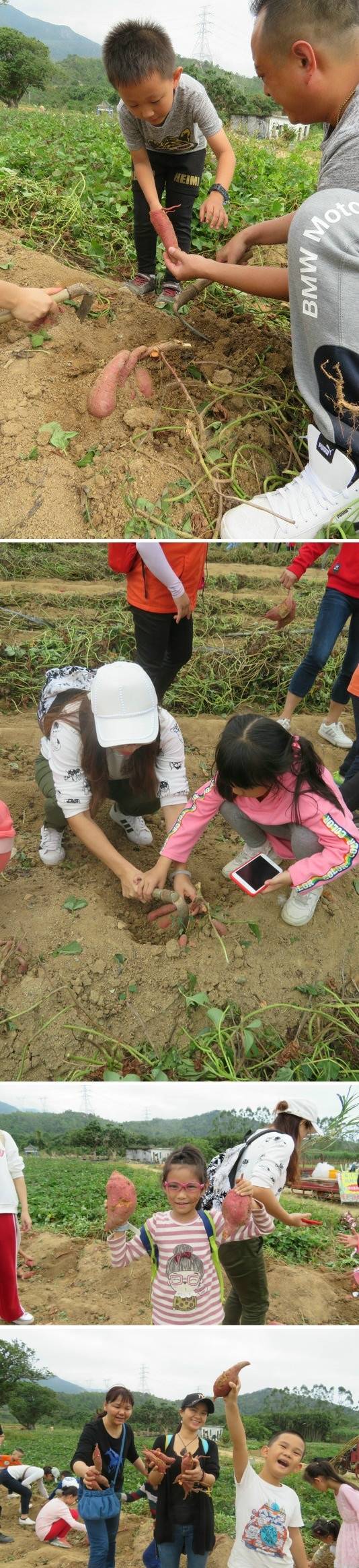 秋天红薯熟了,一根红薯藤下面几个红薯依偎在一起,埋藏在地下,同学们挥舞着锄头,收获着各种大大小小的红薯。