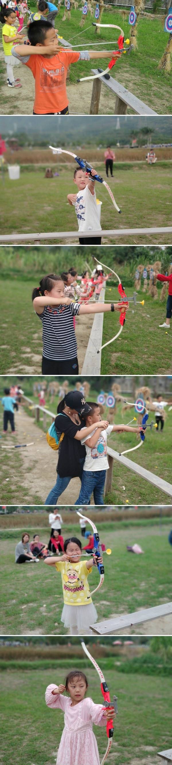 在老师和爸爸妈妈的指导下,孩子们们学习拉弓射箭,聚精会神瞄准靶心,可以锻炼孩子们的注意力和双手的协调能力!