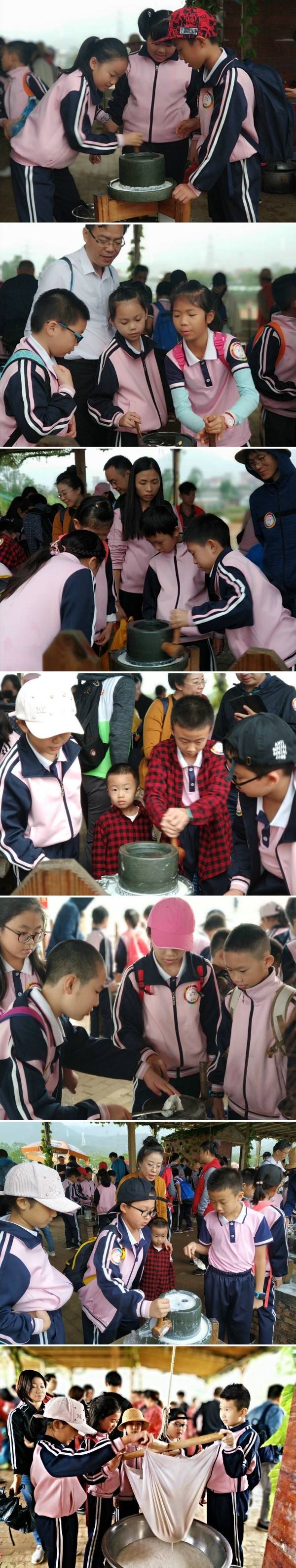 导师教孩子们用石磨磨豆浆,这是需要团队协作的活动,孩子分组一起动手把一颗颗的黄豆,磨成豆浆,然后煮熟,变成大家的饮品。