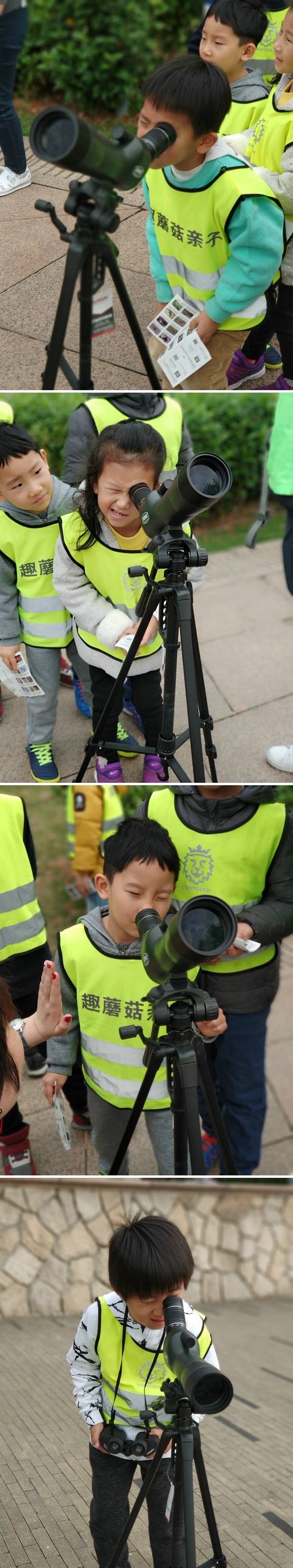 用单筒高倍数望远镜观察,孩子们看到以前没有观察过的景象,感叹大自然的神奇。