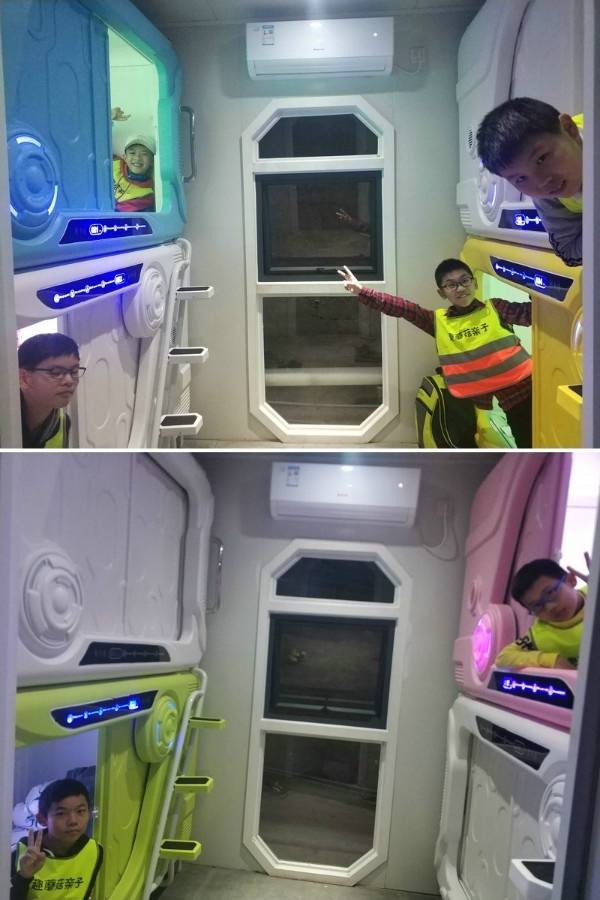 晚上入住充满科技感的太空舱,孩子们非常好奇。