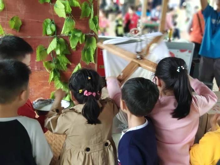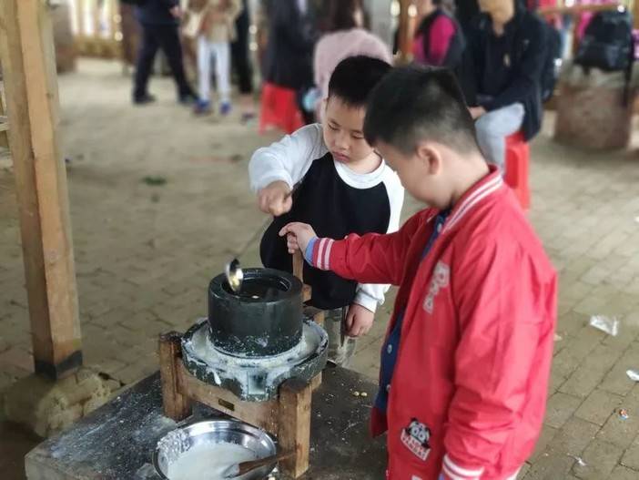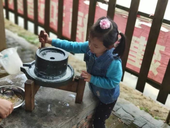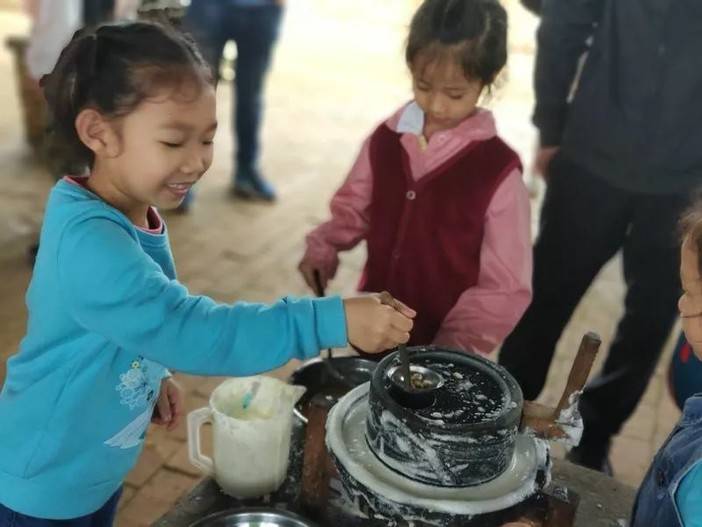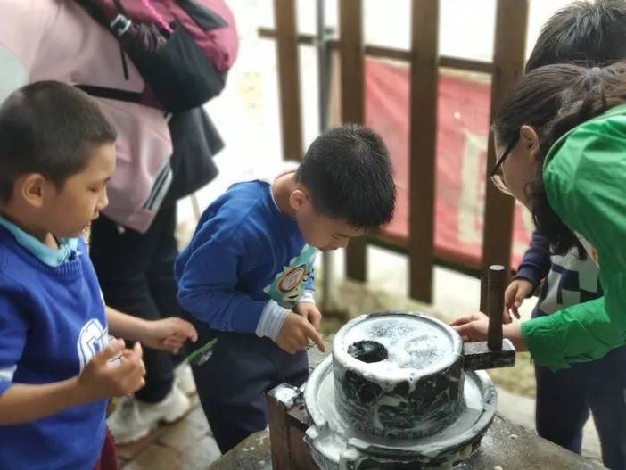 导师教孩子们用石磨磨豆浆,这是需要团队协作的活动,孩子分组一起动手把一颗颗的黄豆,磨成豆浆,然后煮熟,变成大家的饮品。