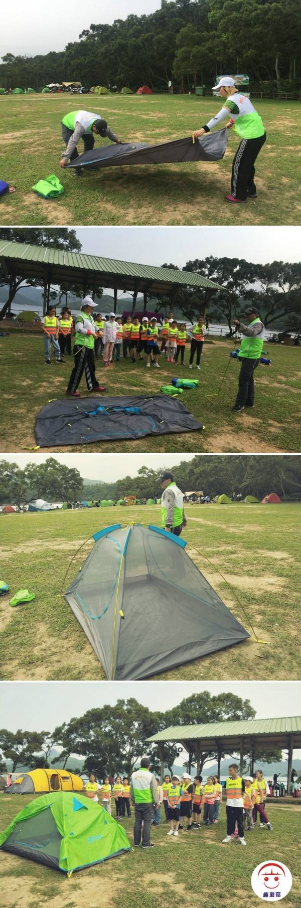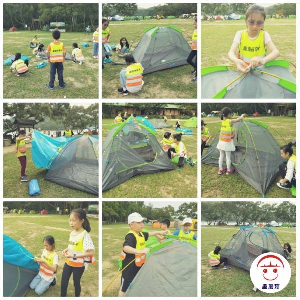 经过导师的讲解后,孩子分组自行搭建帐篷,大家一起合作。