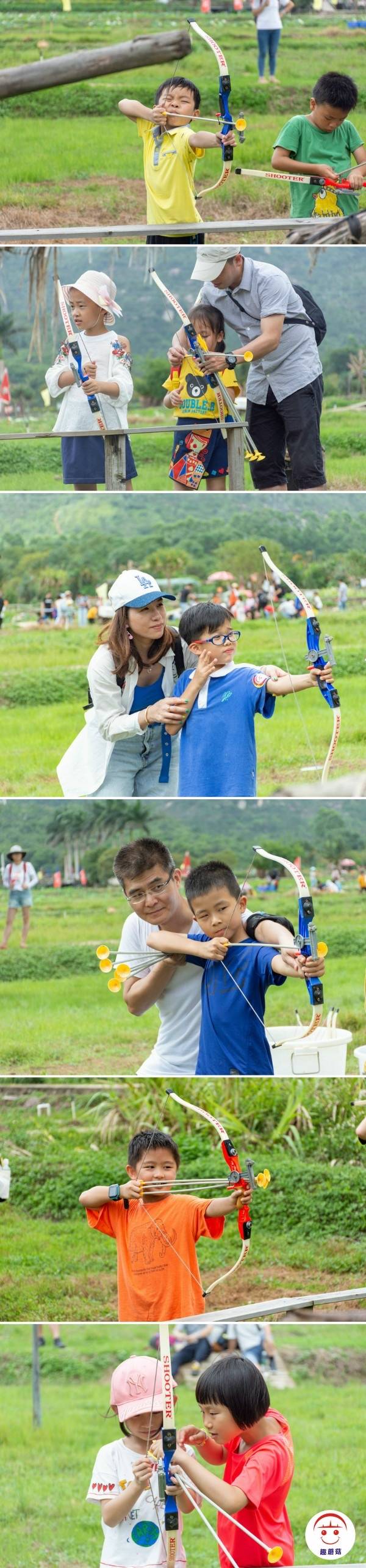 在导师和爸爸妈妈的指导下,孩子们学习拉弓射箭,聚精会神瞄准靶心,可以锻炼孩子们的注意力和双手的协调能力!