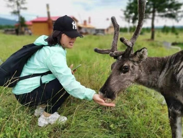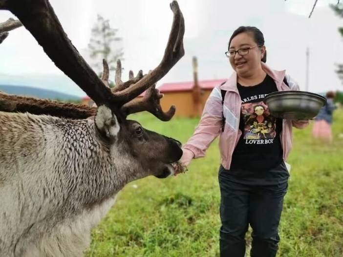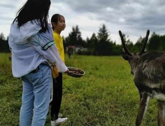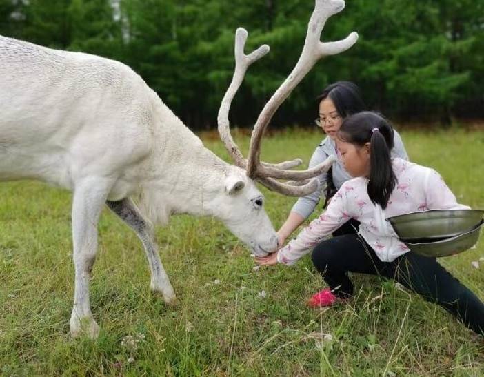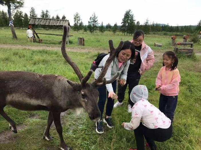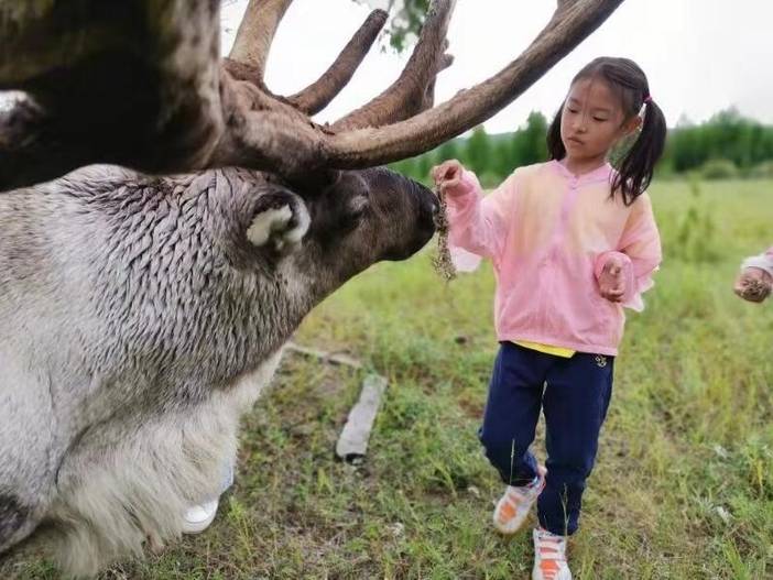 看着传说中的驯鹿,孩子们争先恐后参与到和它们的互动中。递上新鲜的苔藓,它听话地靠近,张开嘴巴开始吃起来。