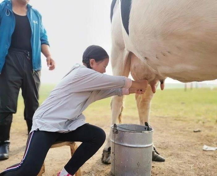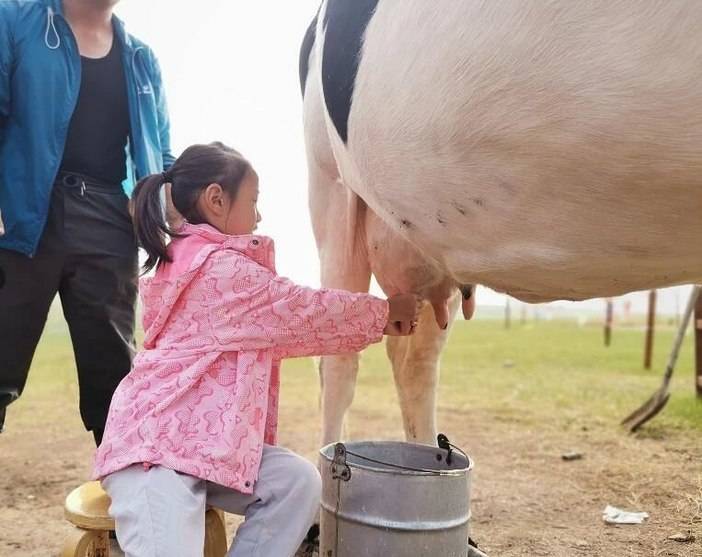 牧场上奶牛不等人!大奶牛挤奶要及时!一头黑白两色的大奶牛早早和孩子们问安了,奶包很大哦。坐在凳子上孩子开始有些害怕,在牧人的指导下,就很放心了!