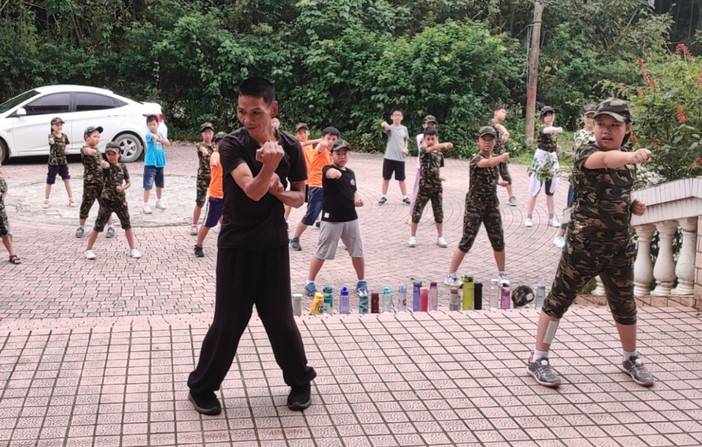 我们学习列队,咏春拳法,站军姿,敬军礼!