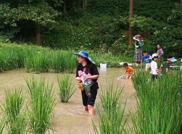 大家伙们在稻田里拿着鱼网走来走去!寻觅鱼儿的踪迹!