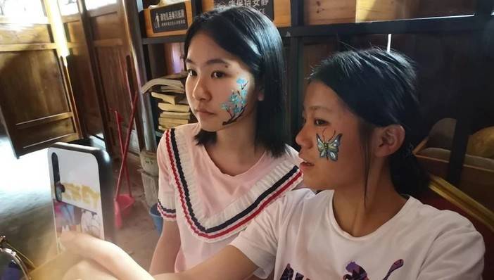 这是来侗寨的第一个体验活动——蜡染,早早来到侗寨的蜡染体验馆,这里先会有扎染师傅教导扎染的方法。孩子们换上服装,把之前画好的蜡染作品染上蓝色!