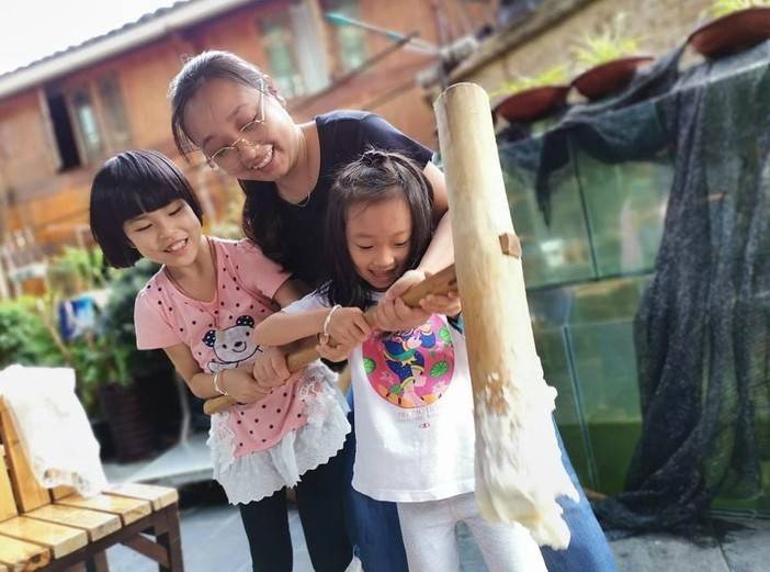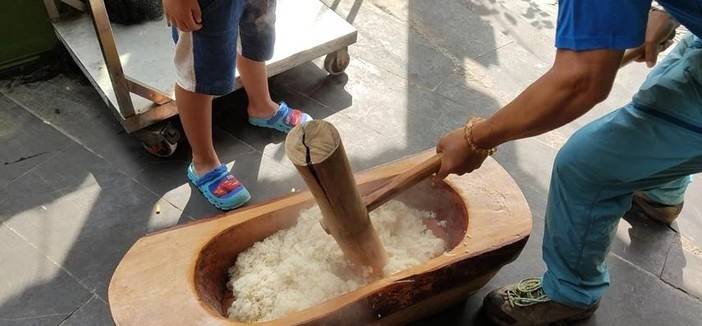 昔日木臼砸年糕活动,现在已经非常少见!这是需要体力和耐力的运动!需要把一粒粒饱满的糯米,木臼砸成糊状!拉丝就算成行,可以做成美味的年糕了!
