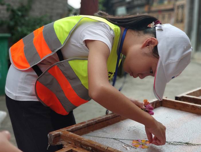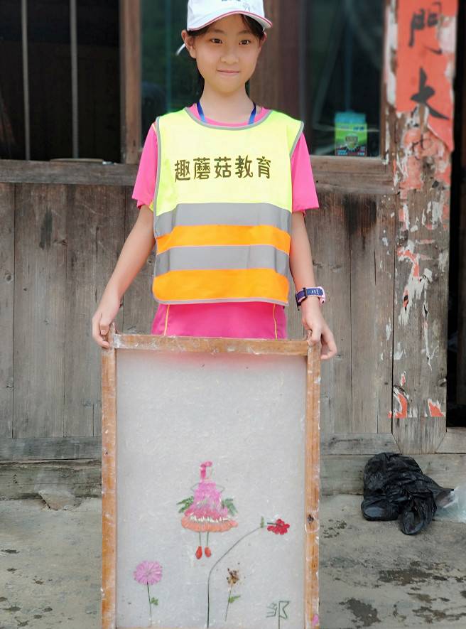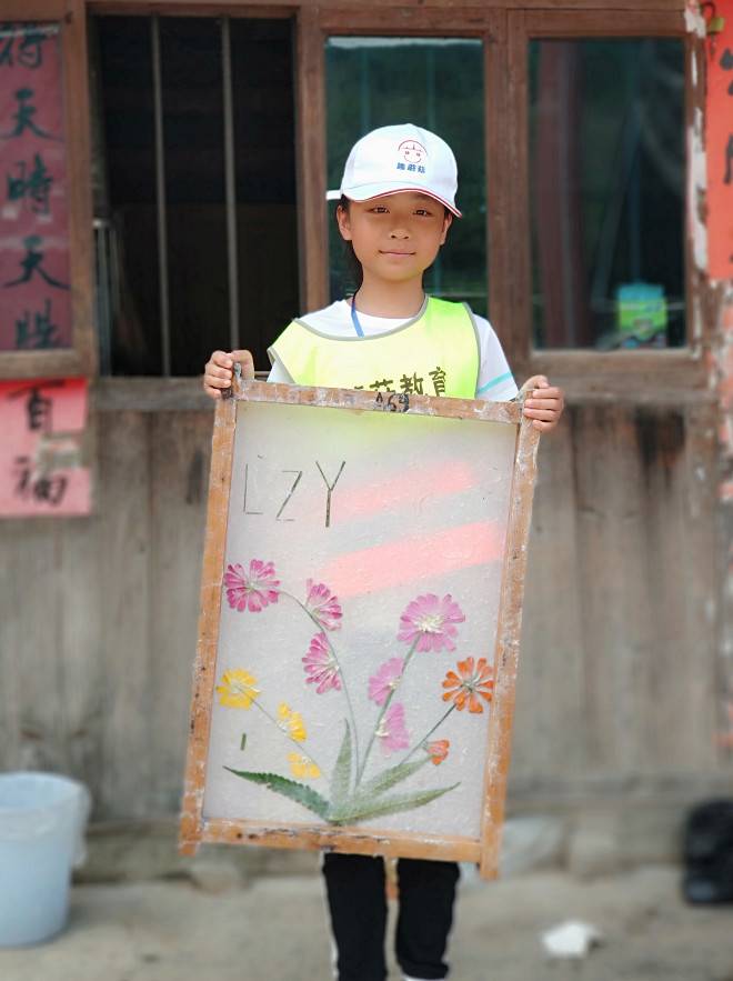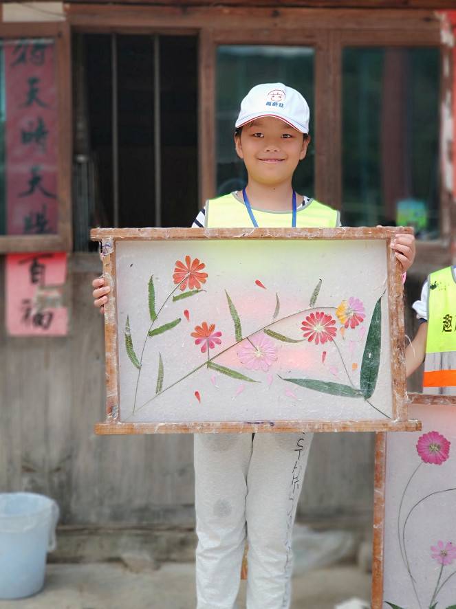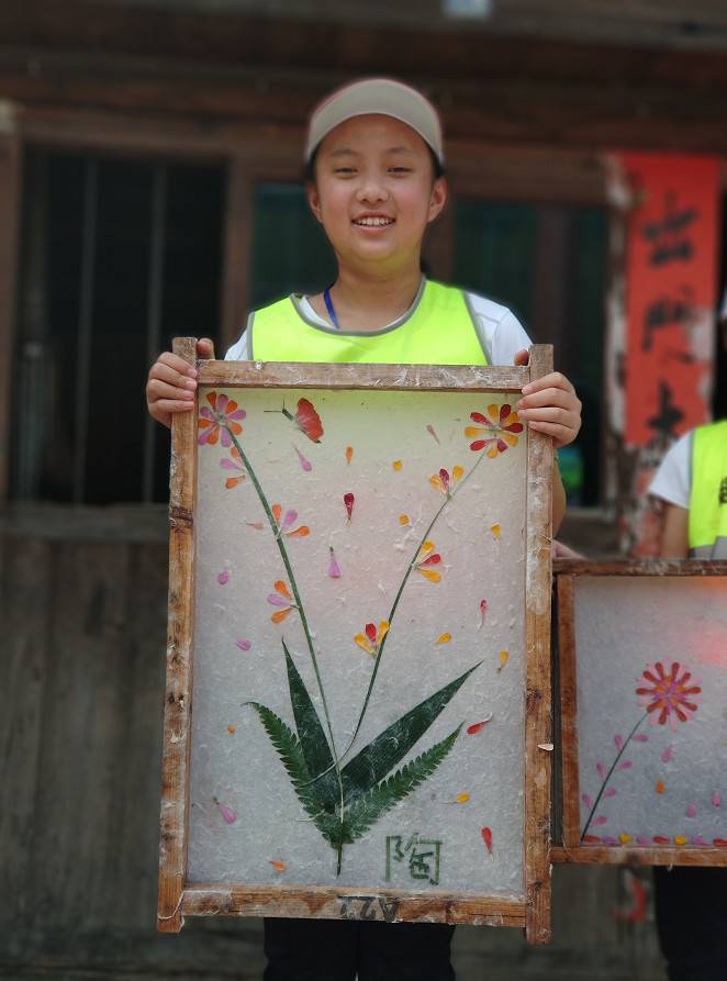 孩子们在未干的纸浆上直接铺就花草。经特殊处理及自然哄干而成,不仅有美丽的细纹,纯天然的压花,十分漂亮的纸张!