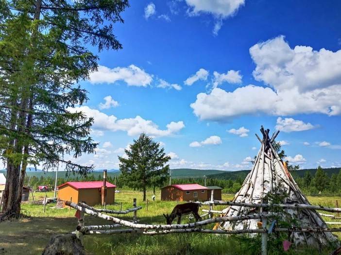 就要揭开这驯鹿森林的神秘面纱了!孩子们端着给驯鹿的纯天然草料,蹦着、跳着往前面的森林里奔去!笔直的桦树林边,一顶顶白色的帐篷映入眼帘。