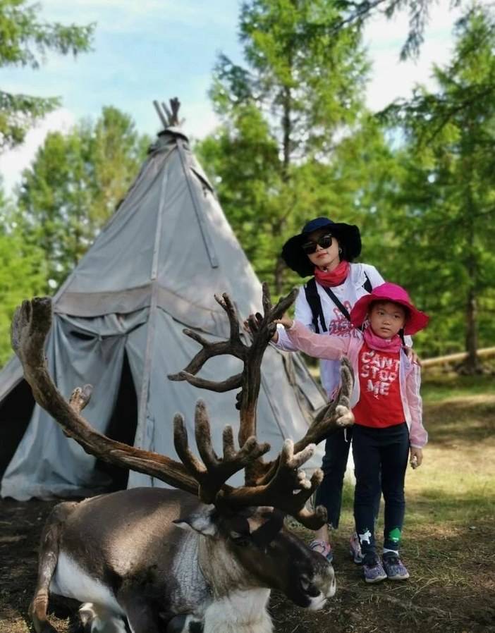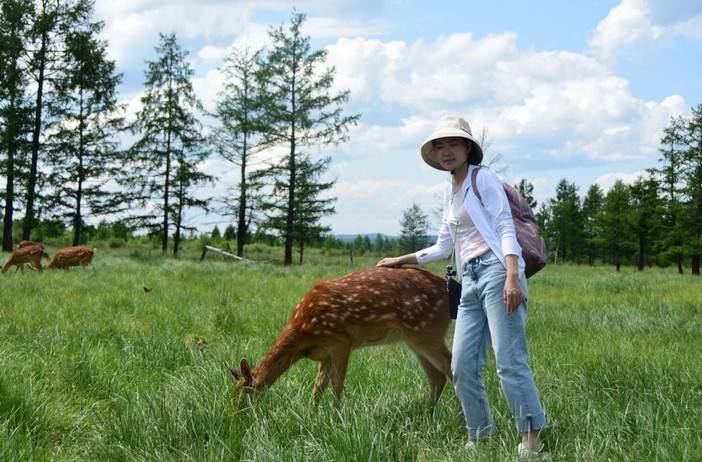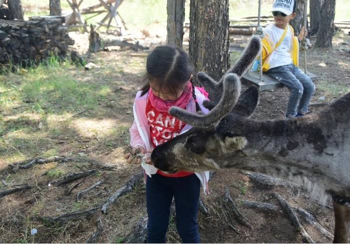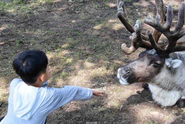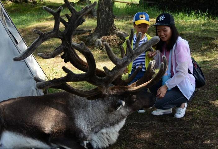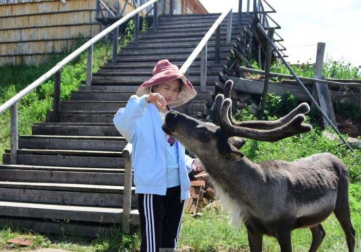 和小驯鹿亲密接触,它们有的头顶鹿角还没有长全,只要用草引诱,就会凑过来添食!