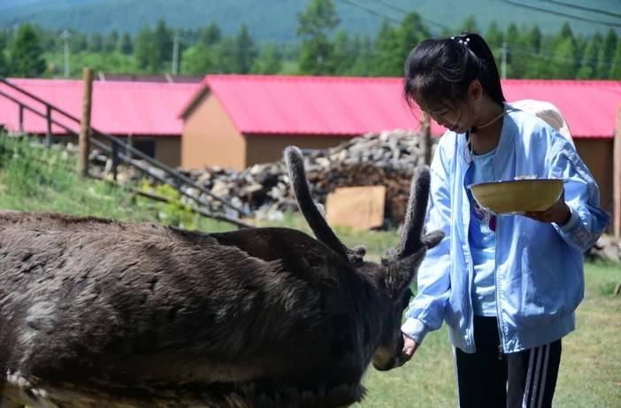 已经成年的驯鹿,似乎也不怕人,草料在手,就很自然地和你亲近!