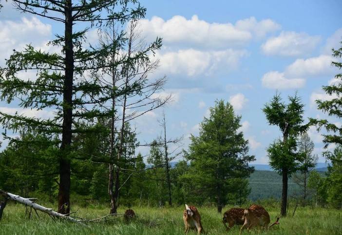 旁边的草原上,小鹿们自由悠闲地在觅食