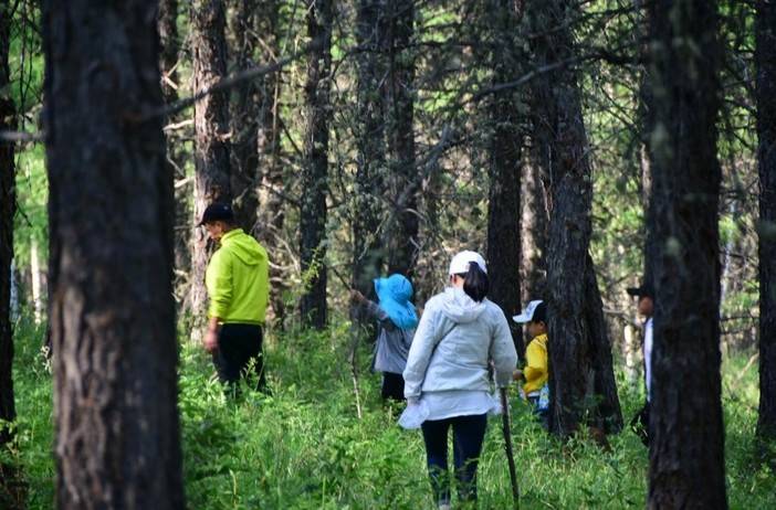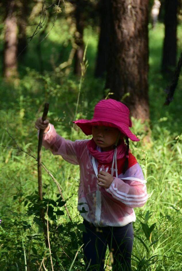 低着头、手拄着木棍,孩子们一路打着草,用来探路,走一步看四回,好不容易发现了一丛蘑菇,这是给驯鹿带回去的晚餐!