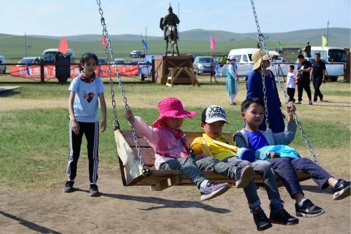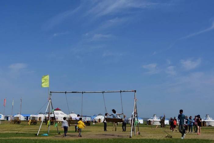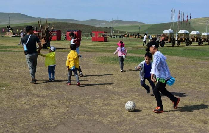 草原大本营,孩子们踢足球、荡秋千……
