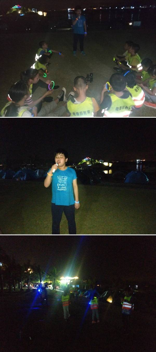 晚上夜幕降临,荧光晚会开始,大家一起歌唱,表演节目,一起欢乐,增加队员之间友谊。