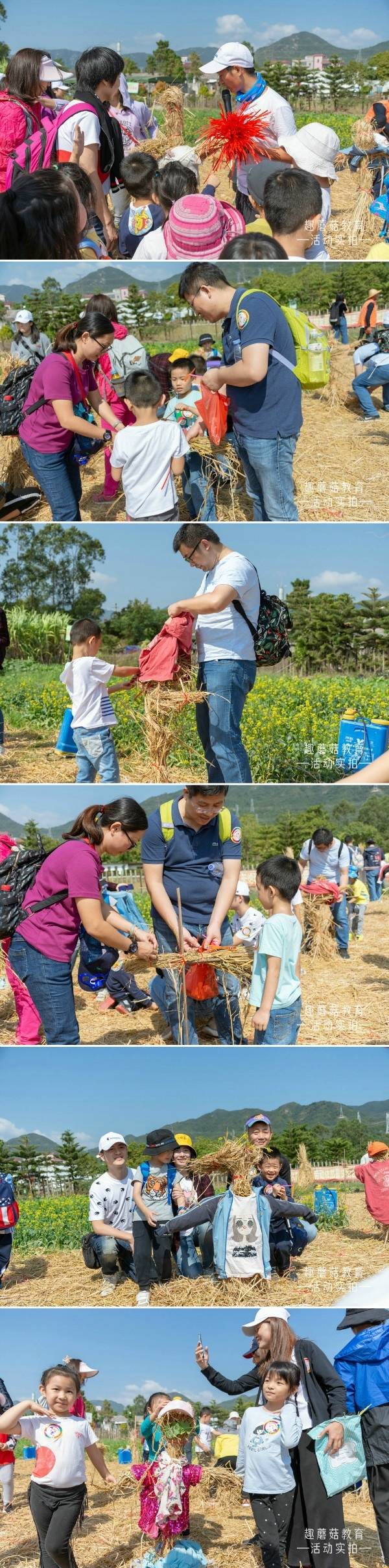 在爸爸妈妈的指导下,小朋友们分小组进行扎稻草人活动。同学们之间相互配合,给稻草装饰点缀,很快一个个有模有样的稻草人竖立在田野中。