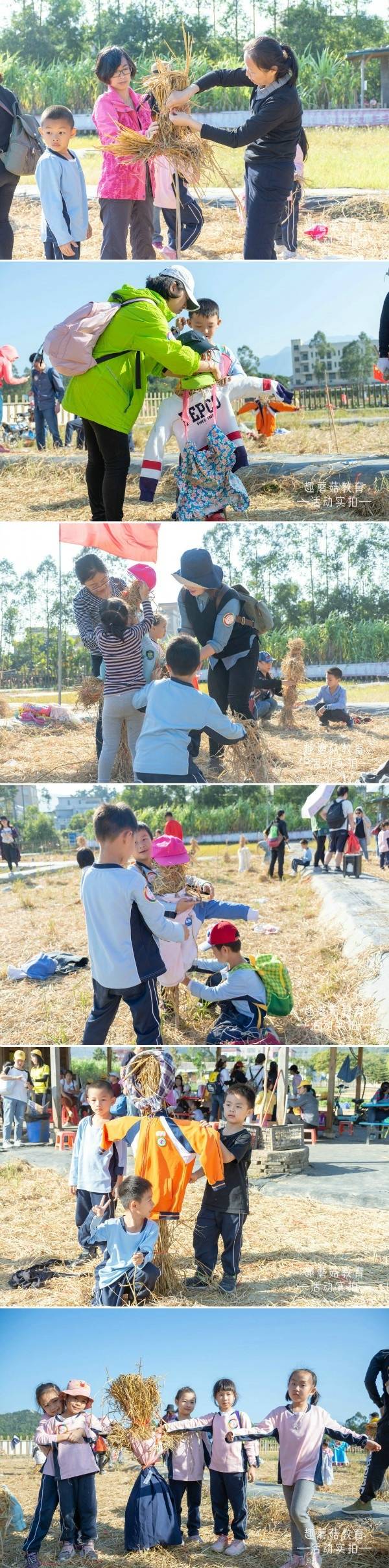 在爸爸妈妈的帮助下,小朋友们分小组进行扎稻草人活动。同学们之间相互配合,给稻草装饰点缀,很快一个个有模有样的稻草人竖立在田野中。