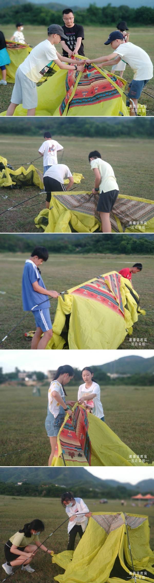 经过大家的齐心协力,很快一个个干净的帐篷树立在草坪上。