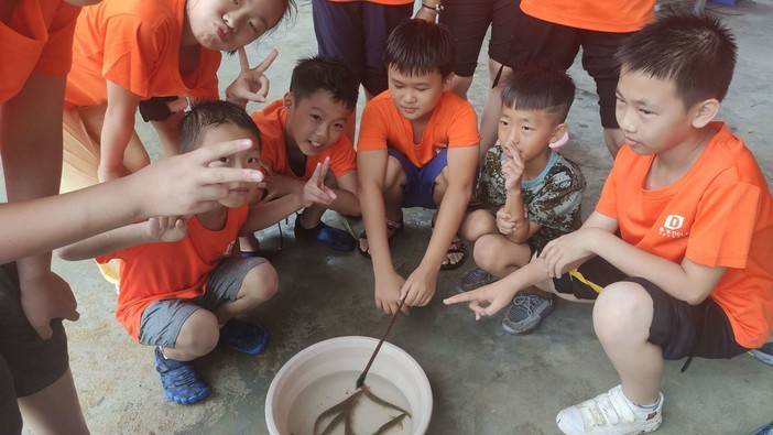 泥鳅小哥心想:我好不容易出来透透气,老师就带小妖们来关照我,虽然我长得帅,也不用带这么多小妖来看我吧!
