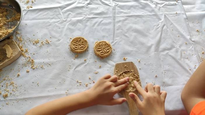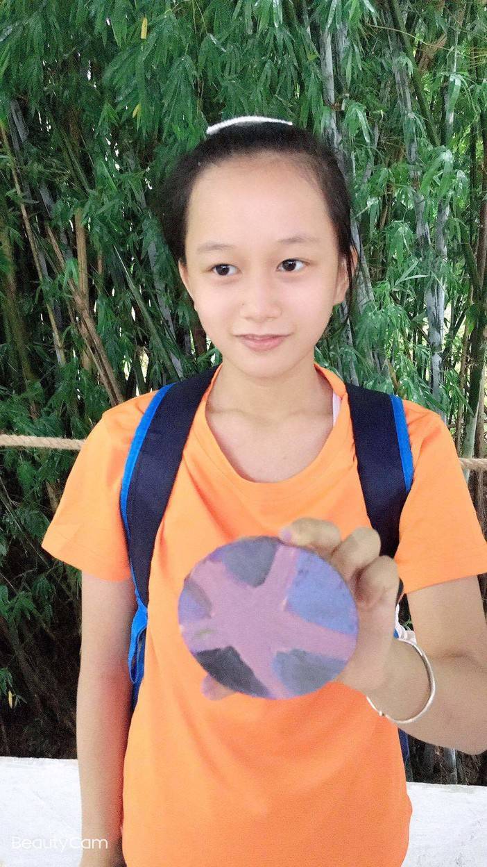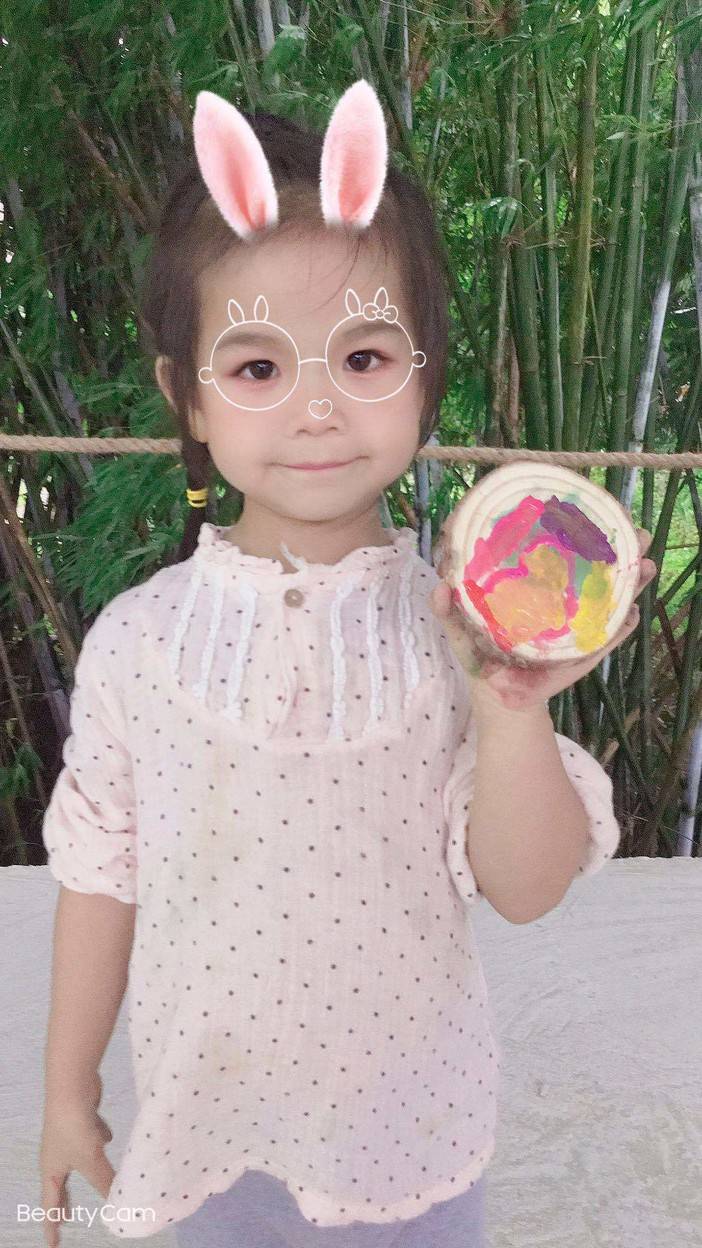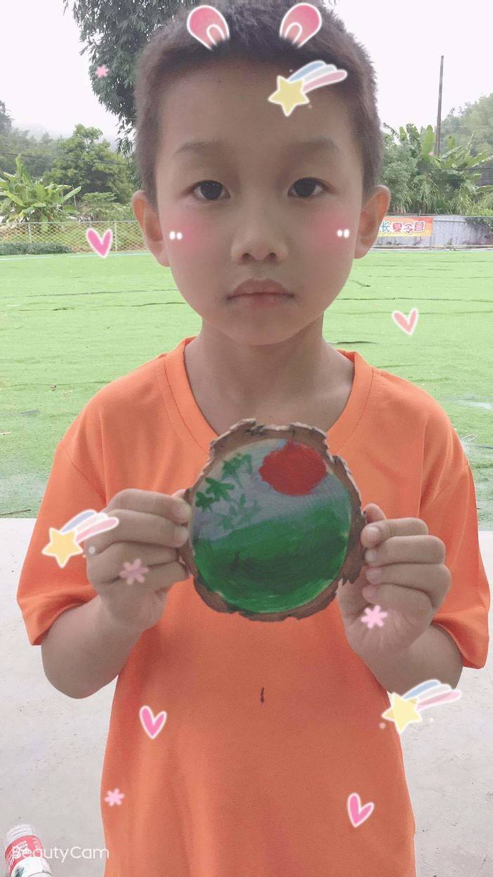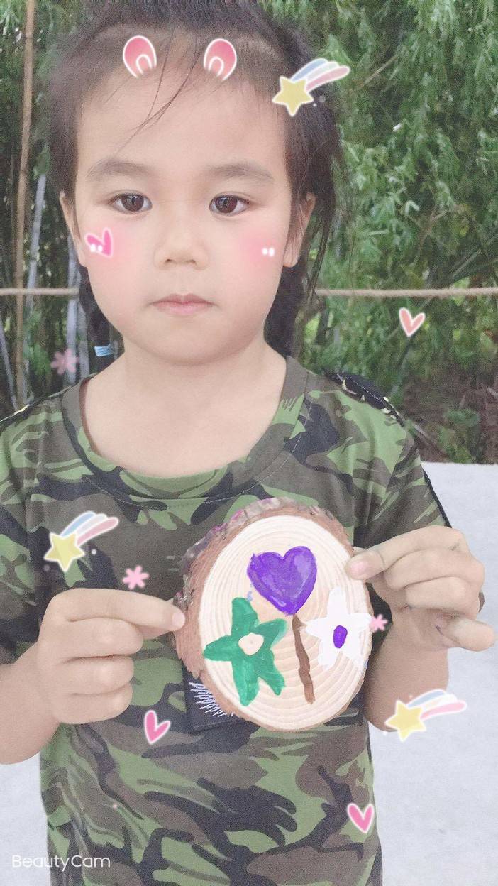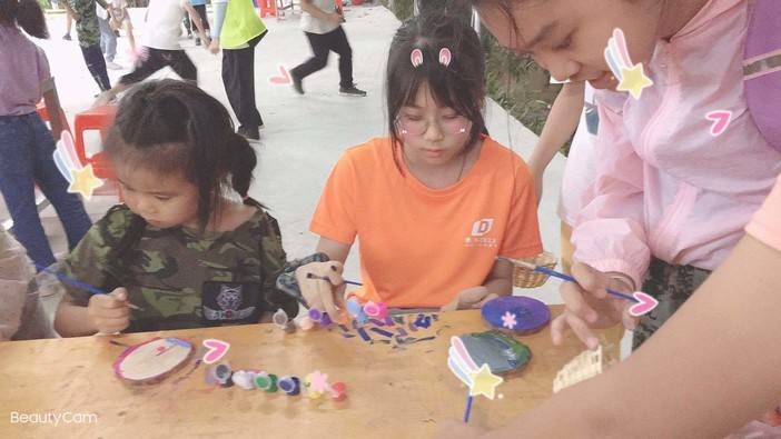 精选手掌大小的圆形年轮原木片,利用特制的颜料,在木片上绘画涂鸦。