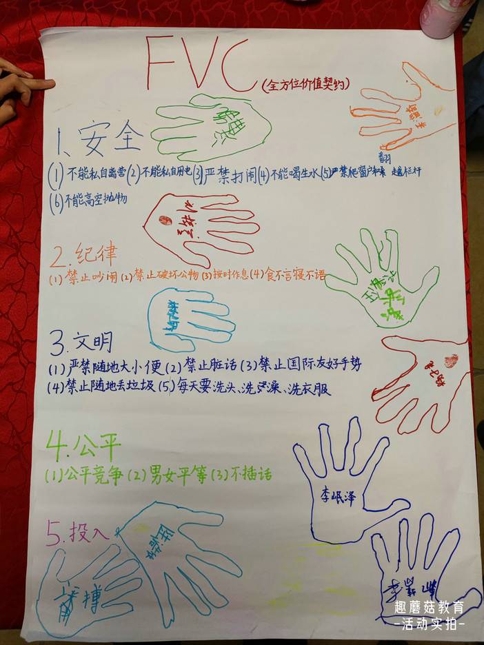 根据FVC(全方位价值契约)引导孩子们一起制定营规,他们自己讨论制定出的规定,会让他们更加无理由的服从。