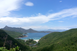 09: 30 沿途欣赏着麦里浩径的第一段美丽风光,在第二段的起点落下,热身做下准备工作,开始我们今天的徒步之旅!二段的前半段小路居多,凹凸不平,首先要挑战的就是小小山路,沿着山路走,旁边映入眼帘便是一望无际的大海,香港的沙滩很干净,沙子也比较细,穿过第一个沙滩,稍作休息!