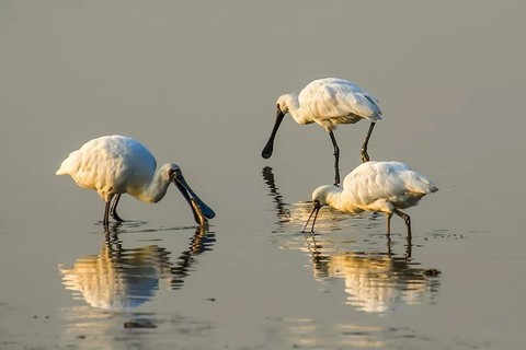 它们成群结对、姿态优雅,在这里慢步觅食。把嘴巴插在水里不停吃喝的黑脸琵鹭,优雅的飞行的白鹭;划过水面再飞向天空的鸬鹚;游荡的针尾鸭,池鹭和矶鹬在滩涂上不停巡视……