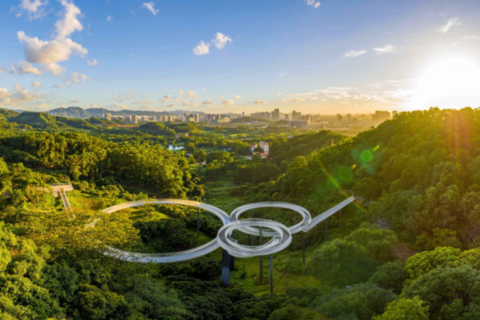 占地403万㎡虹桥公园是连接南山、宝安西部生态走廊上的重要节点。其中亮点工程“虹桥”全长4公里,西起新城公园,东接马拉松山湖绿道,虹桥如一条醒目的“红飘带”,将新城公园、虹桥公园、大顶岭山林公园串联成完整的城市生态片区。公园以“绿野光明,生态之巅”为定位规划“一轴三区”,以主轴虹桥串联入口区、碧湖运动区及森林运动区,未来游客将在这里同享创意运动、都市休闲与生态科研的风采与活力。