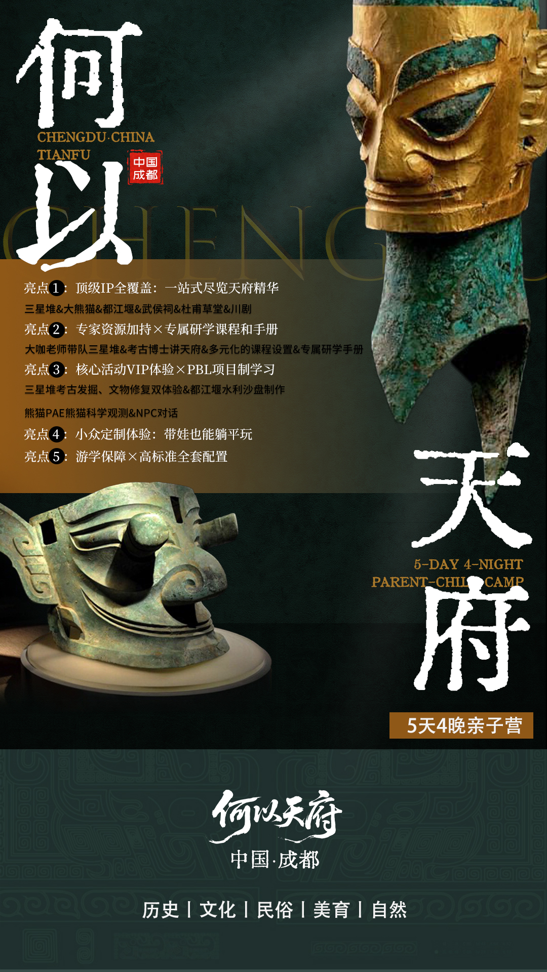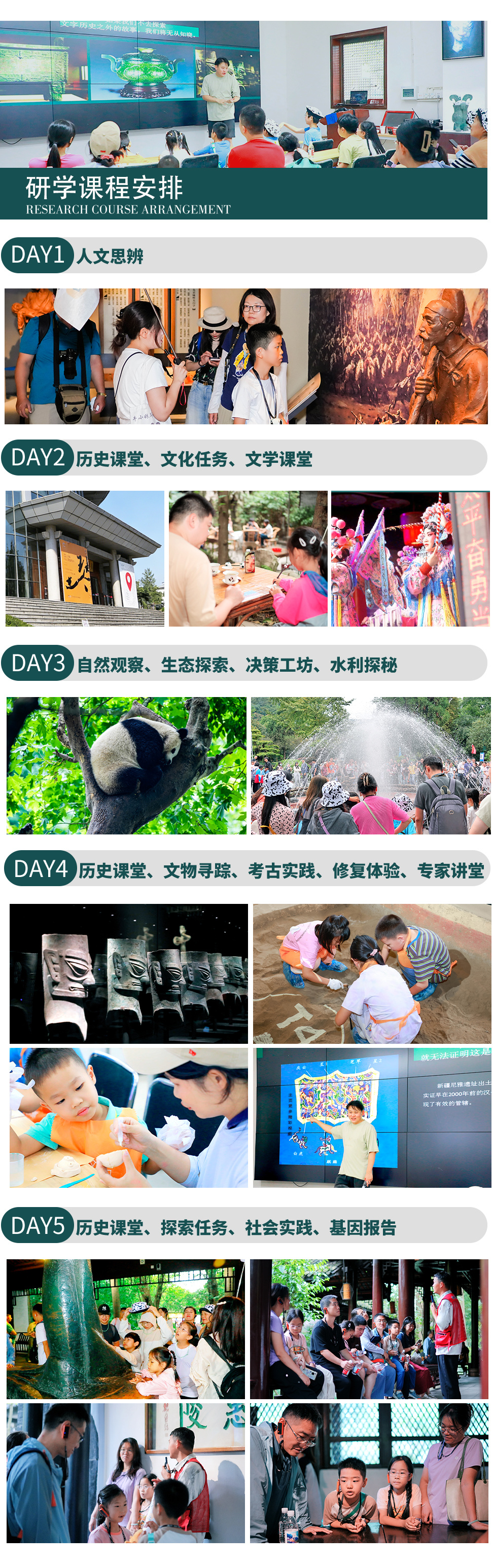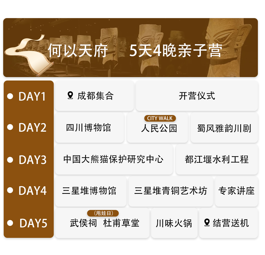 整趟旅程是—场沉浸式文化考古,孩子们将像考古学家—样,每日挖掘—个文化基因片段,完成从 “碎片”到“图谱”的整合,构建对成都立体而完整的理解,获得可迁移的思维方式和文化洞察力