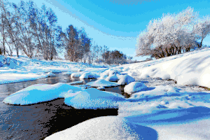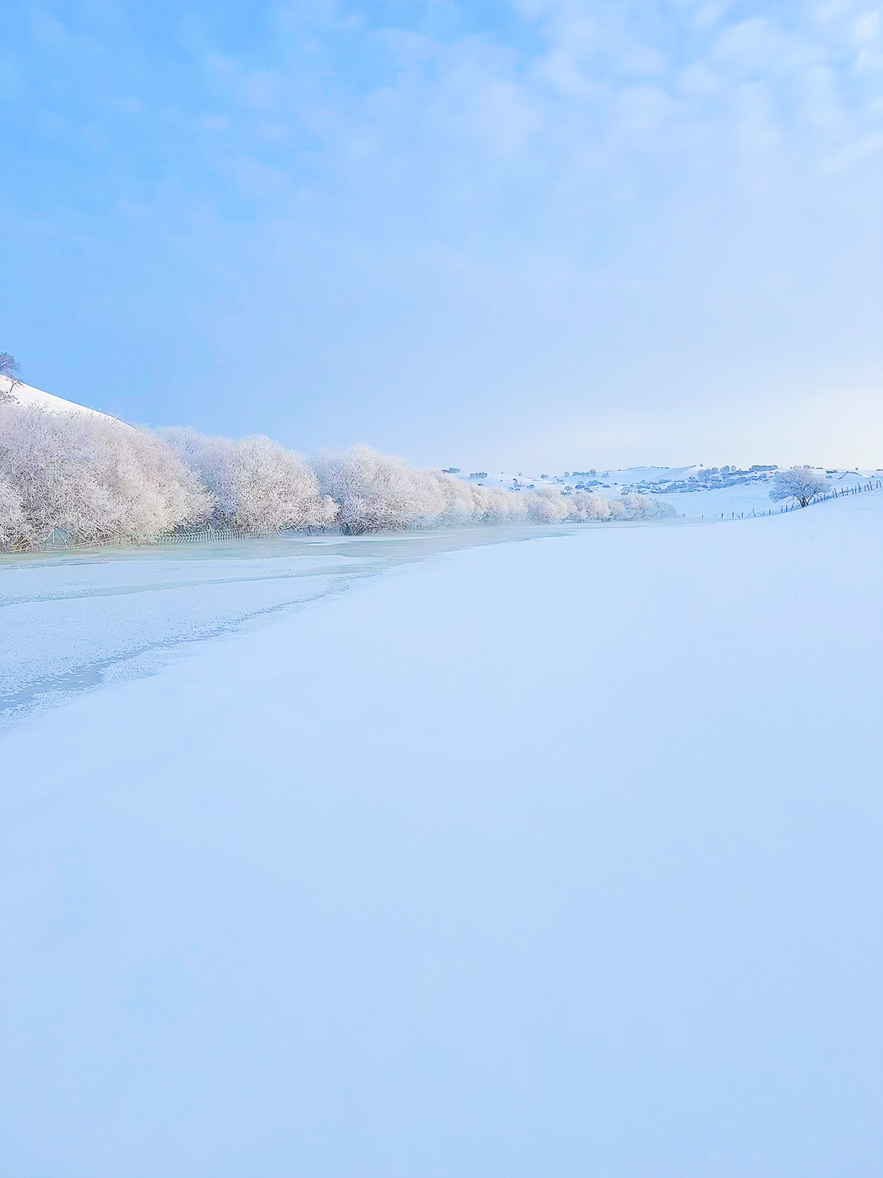 邂逅乌兰布统的「雪国风光」,从小河头村的日出开始。河流中有着晶莹剔透的冰花,冬日的早晨雾气弥漫在河流上,枝头挂满雾凇。