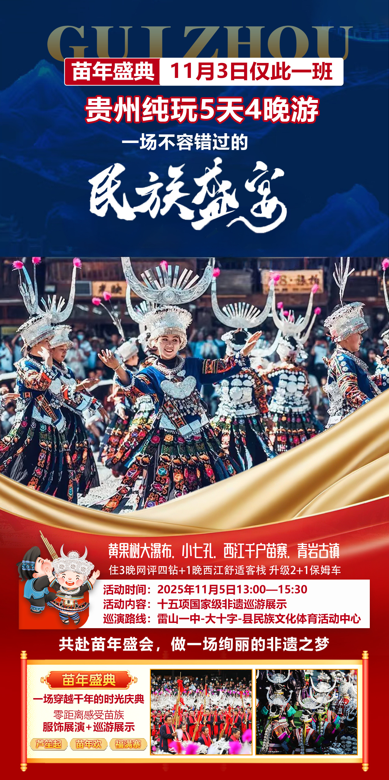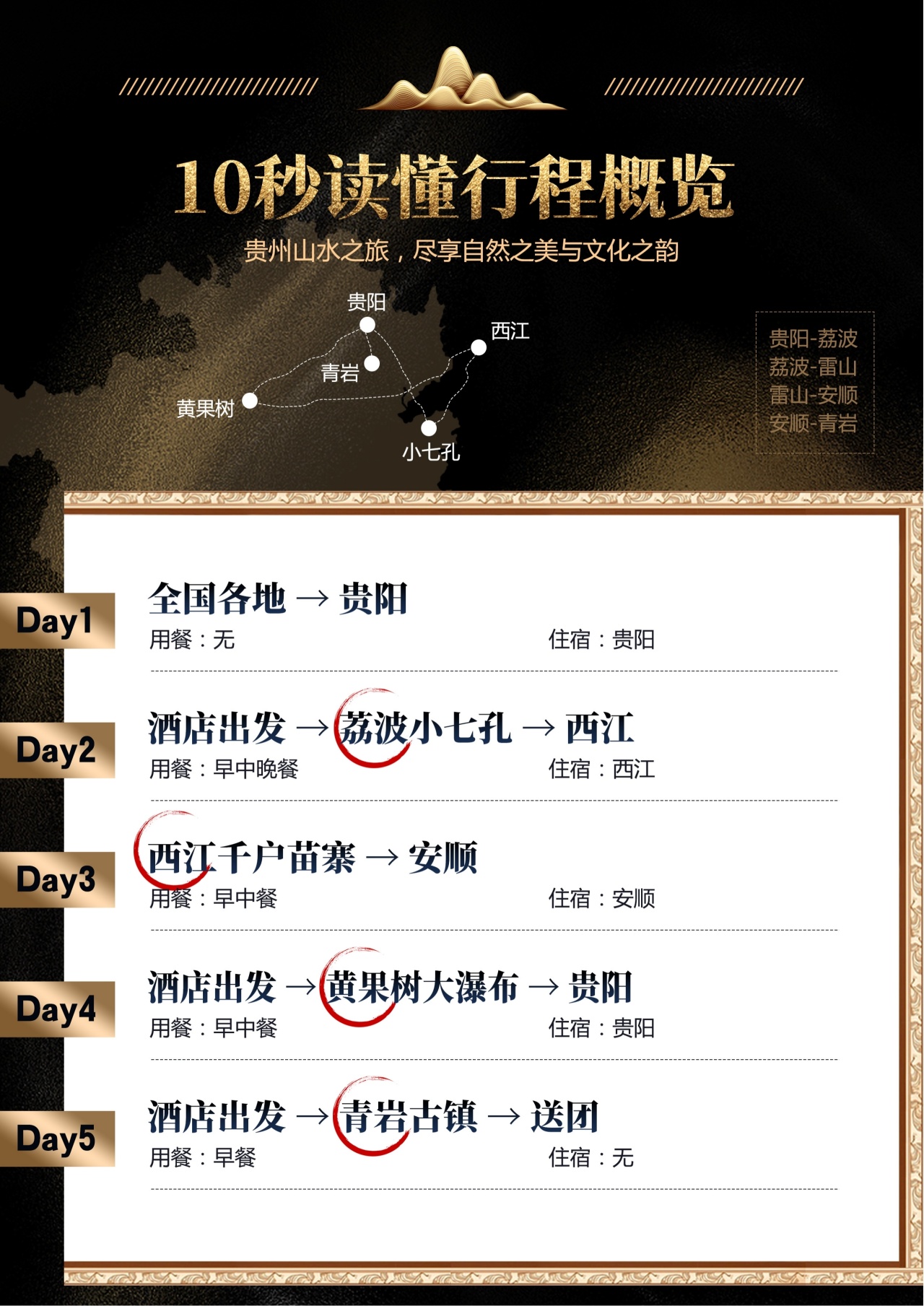 2. 不含景区必消小交通:黄果树大瀑布观光车50元/人+保险10元/人、小七孔观光车40元/人+保险10元/人、西江4程观光车20元/人+保险10元/人,青岩观光车25元/人,费用需自理。总合计:165元