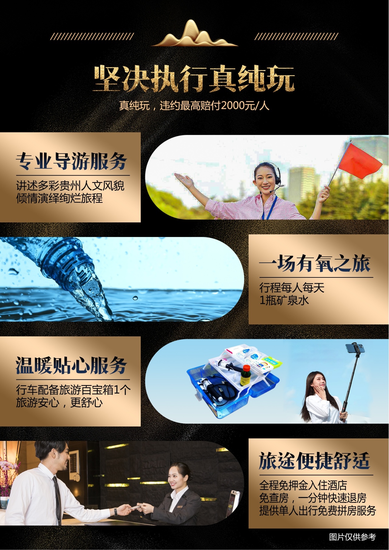 备注:本产品执行真正纯玩,违约最高赔付2000元/人,贵州省大部分景区、酒店、餐厅都有其商业服务配套,甚至还会有讲解员为游客推荐解说,这并非我社安排的购物店范畴,请根据自身所需谨慎选购,此类投诉恕我社无法受理,敬请留意。