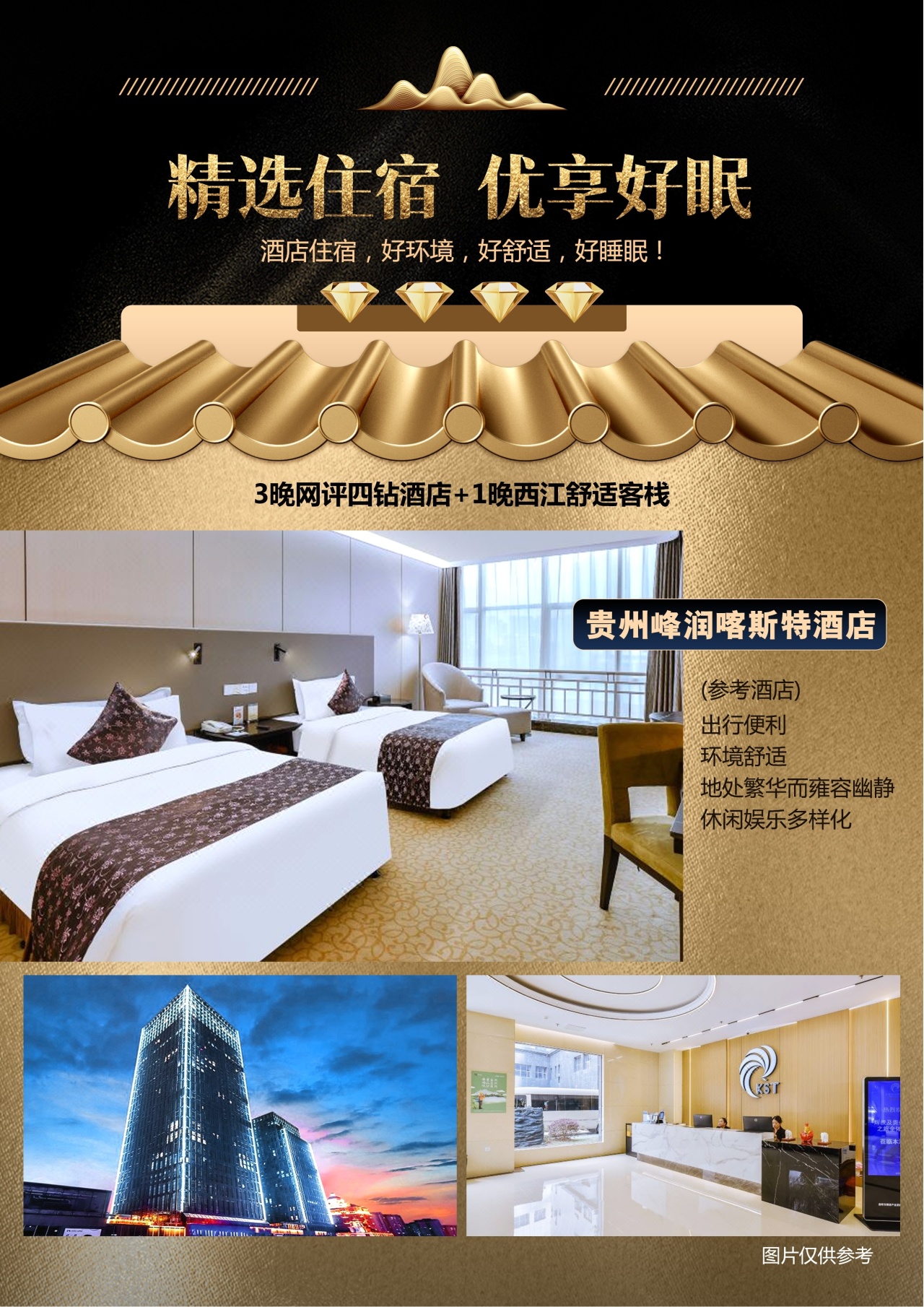 2. 住宿:三晚网评四钻+1晚西江精品客栈,如需单人用一间房请自行另补单房差或者接受安排拼房。