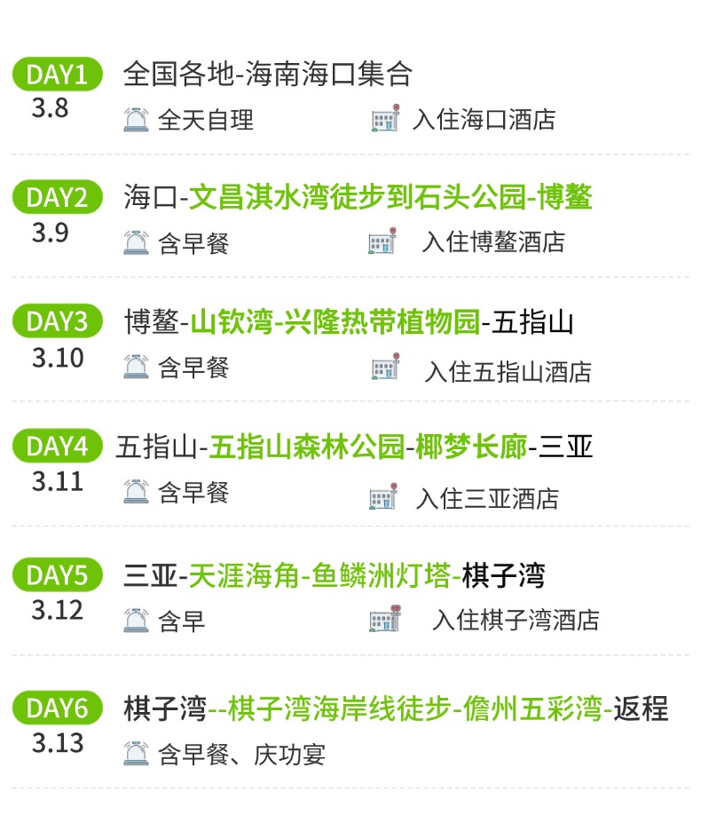 午餐自带干粮或者找家餐厅AA聚餐。徒步完之后上车前往博鳌住宿。