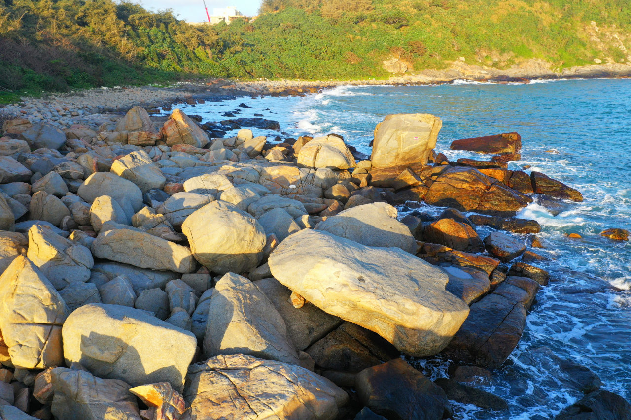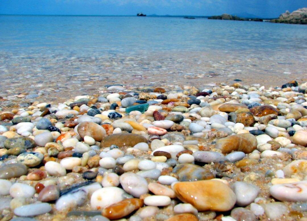 岸边礁石间有一片面积约几百平方米撒满彩色棋子的卵石滩,白色、宝石绿色、土红色、蛋黄色;像翡翠、似玛瑙,十分精彩绝妙。