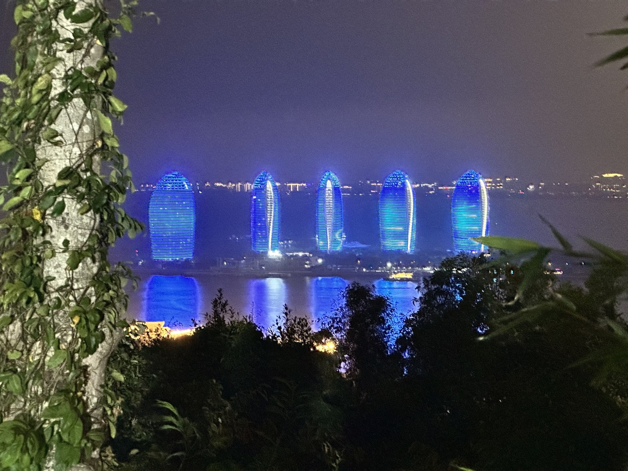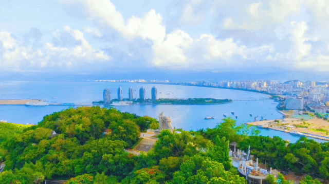 这座山三面临海,状似坡鹿,高275米,登上鹿回头山顶,三亚市全景尽收眼底。